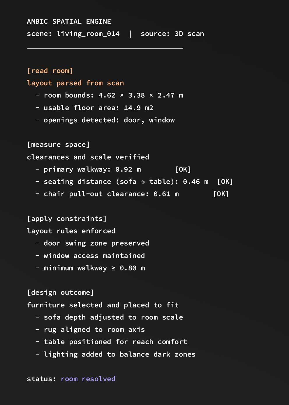 Ambic captures the layout, scale, and clearances of your space. Furniture is selected and arranged to work within your room’s actual constraints